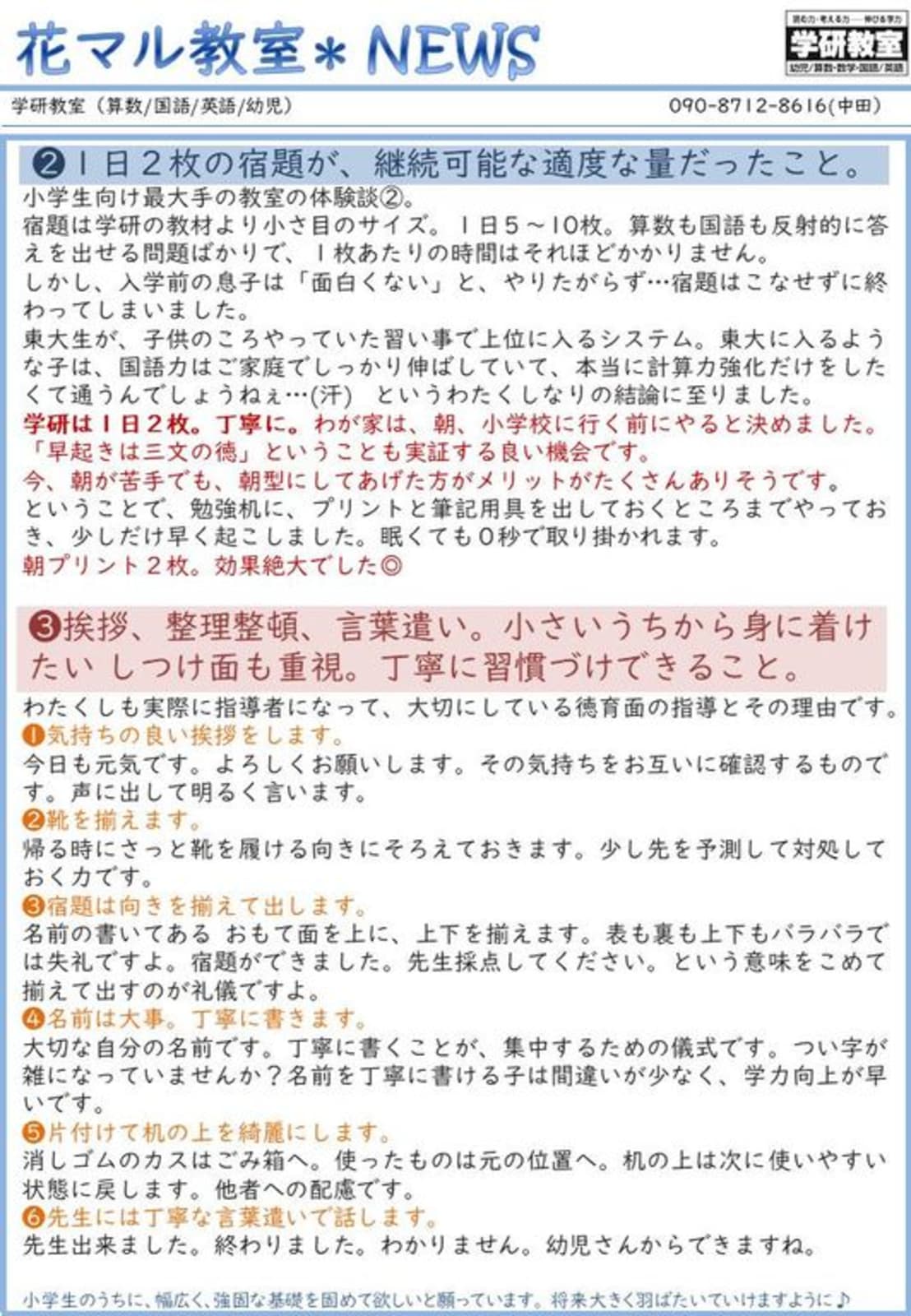 小学校に上がる前に入学準備を始めませんか?無料体験実施中です! 学研教材は 学習指導要領の内容をすべてカバーしており、少しずつステップアップしながら、基礎から応用までしっかりと身に付けることが出来ます。 また幼児教材は、小学校の学習内容のスムーズな理解に繋がるよう系統立てて作成されています。 入学前から学研教室で学習して、自信を持ってピカピカの一年生になりませんか? 一人一人に合わせたオーダーメイド学習プランをご提案致します。 是非お気軽にお問い合わせください。お待ちしております。 |