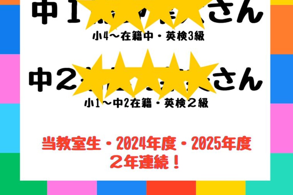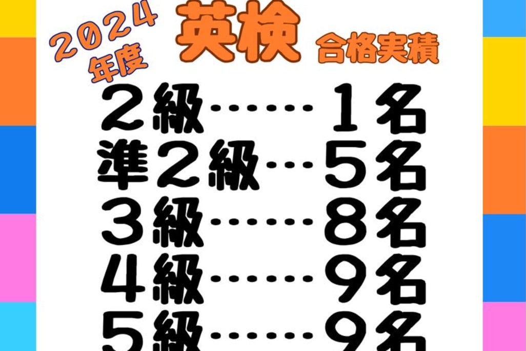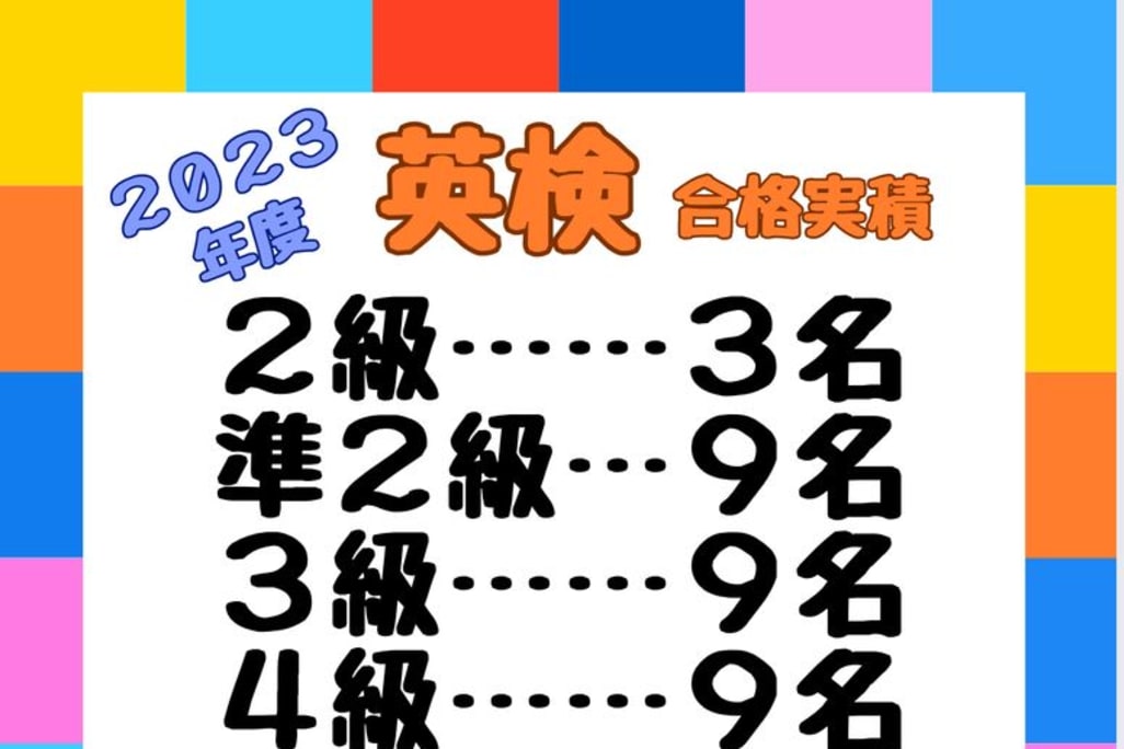 ♯インスタグラム始めました。◆幼児限定土曜コース ①9時~ 開講中 見学お気軽に。 ◆学研教室はいつからでもスタートできます。保護者の皆様、抱え込まずにご相談下さい。持続可能な課題から! ◆「わかりたい」「ほめられたい」「勉強が楽しくなりたい」とお子様は思っています。 ◆2、3歳児、幼保育園のお子様。楽しく実のある幼児コースがお勧めです。 ◆2023年度 英検 合格おめでとうございます。 2級:3名 準2級:9名 3級:9名 4級:9名 5級:13名 ◆2024年度 英検 合格おめでとうございます。 2級:1名 準2級:5名 3級:8名 4級:9名 5級:9名 |