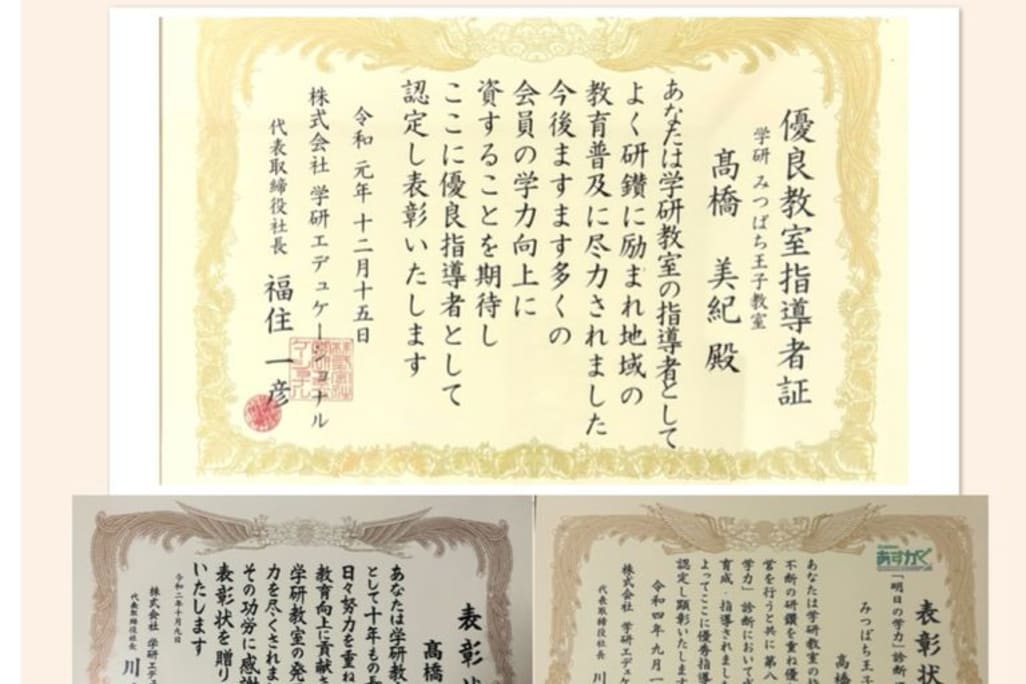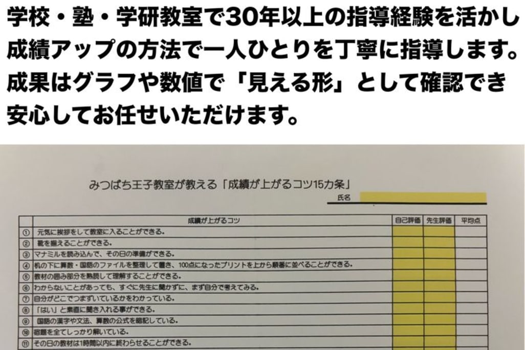 ※下記の会員のコメントは原文通り記しておりますので、誤字脱字はご了承下さい。 月・火・水(英語)・木・金 (午後3:00~午後7:00) 「みつばち王子教室はお子様の基本的な生活態度からきちんと教育することにより学力向上をめざします。」 幼児さんから楽しんでお勉強をする事により、しっかりとした基礎学力が身につきます。 中学校英語の教員免許有り。 ※中学校での指導経験有り。 ※英語受講者では、高校生で英検2級 中学生では英検3級に合格しております。 ※まずは、お気軽にご連絡下さい。