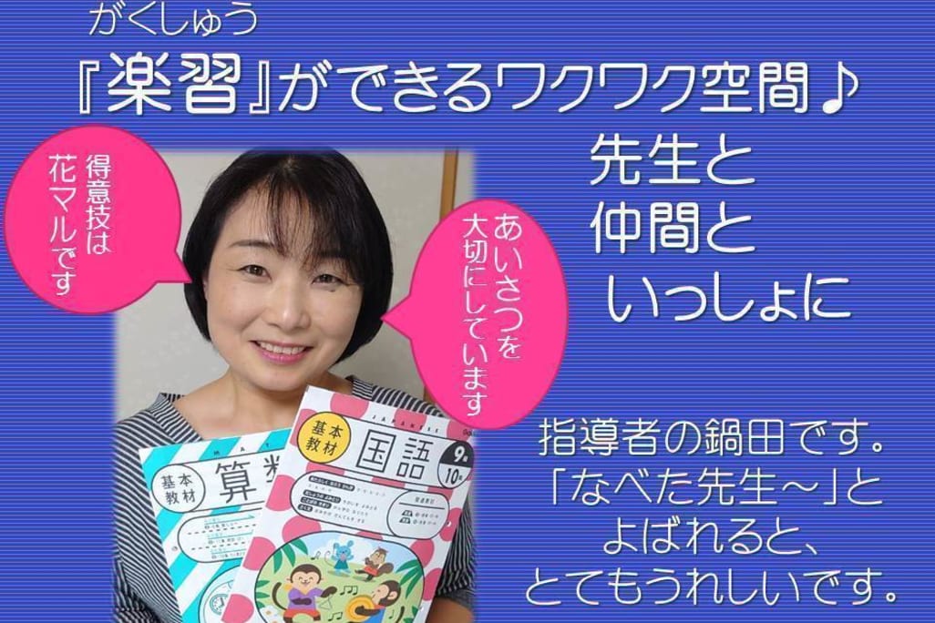 はじめまして。指導者の鍋田です。 富岡教室(月・木)でもお子さんたちと楽しく『楽習』しています。 横浜国立大学教育学部を卒業し、教員免許や保育士資格などを持っています。 「自分で学ぶ力」は一生のたからもの。 苦手になる前に「わかるって楽しい!」をたくさん感じてほしいんです。 がんばった分だけ「できた!」の笑顔が増えるよう、心を込めてサポートします。 子どもたちはみんなちがうから、 教材も声かけも、ひとりひとりに合わせています。 おうちの方も、一人で抱えこまないでくださいね。 お勉強の悩みは、いっしょに考えていきましょう。 ちょっと気持ちが楽になる、そんな教室でありたいです。