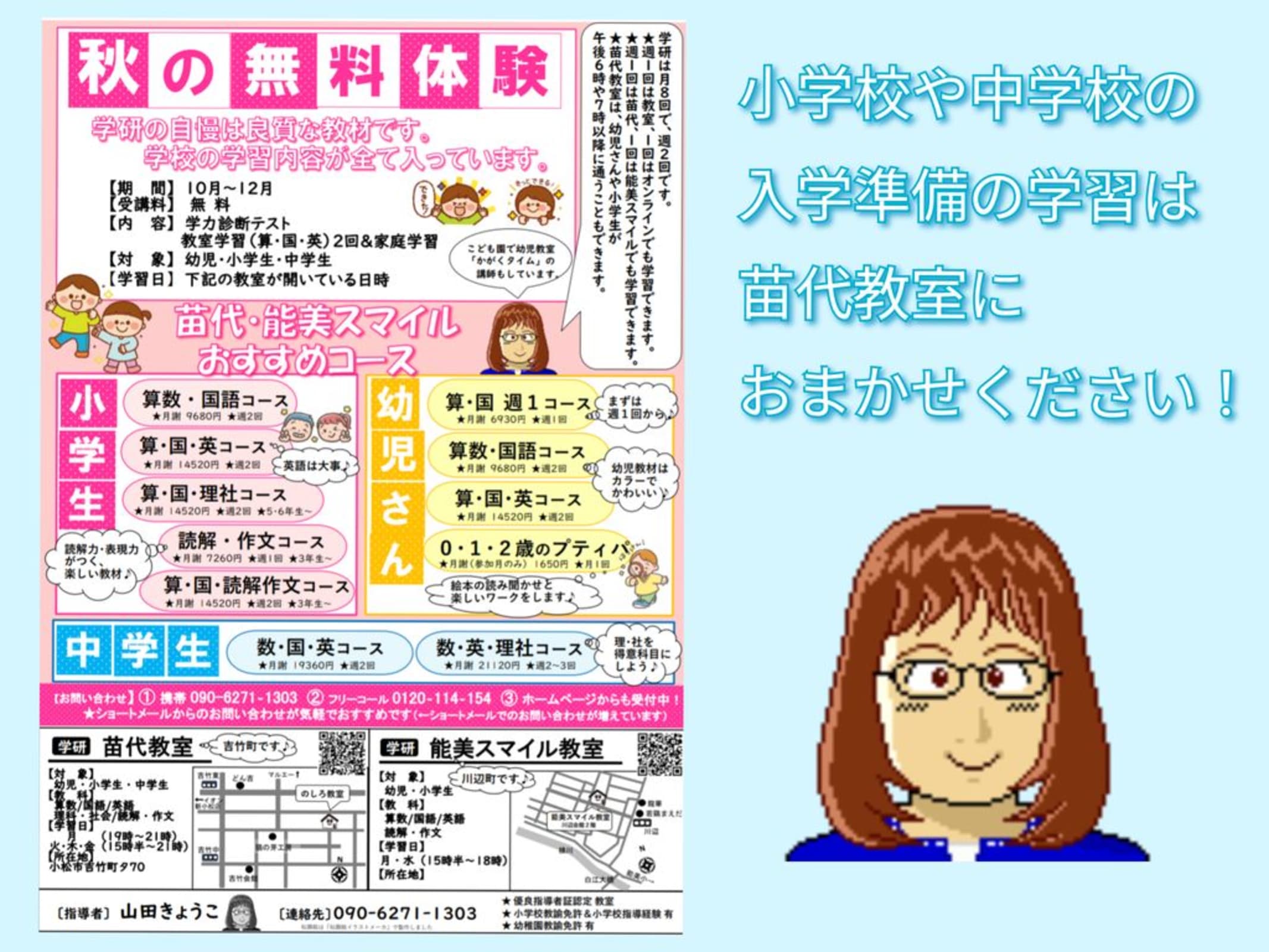 「入学準備の無料体験」参加者募集中です。お問い合わせは090ー6271ー1303まで♪ こんにちは、指導者の山田です。 【教員免許状&幼稚園教諭免許状&小学校の指導経験あり・こども園でかがくタイム(幼児教室)の講師をしています】 小学校の入学に向けて、苗代教室で「入学準備」を始めよう!幼児教材はカラーでかわいくて、楽しく学べます! ◆苦手なことはくり返し学習します ◆学研の教材は学校の学習内容が全て入っている良質な教材です ◆ひとりひとりに合った個別学習です ◆やり抜く力・自主性などの非認知能力も重視しています お友達も誘って来てね! ◆問い合わせ: 山田 090‐6271‐1303 →ショートメールでの問い合わせが気軽でおすすめです。 |