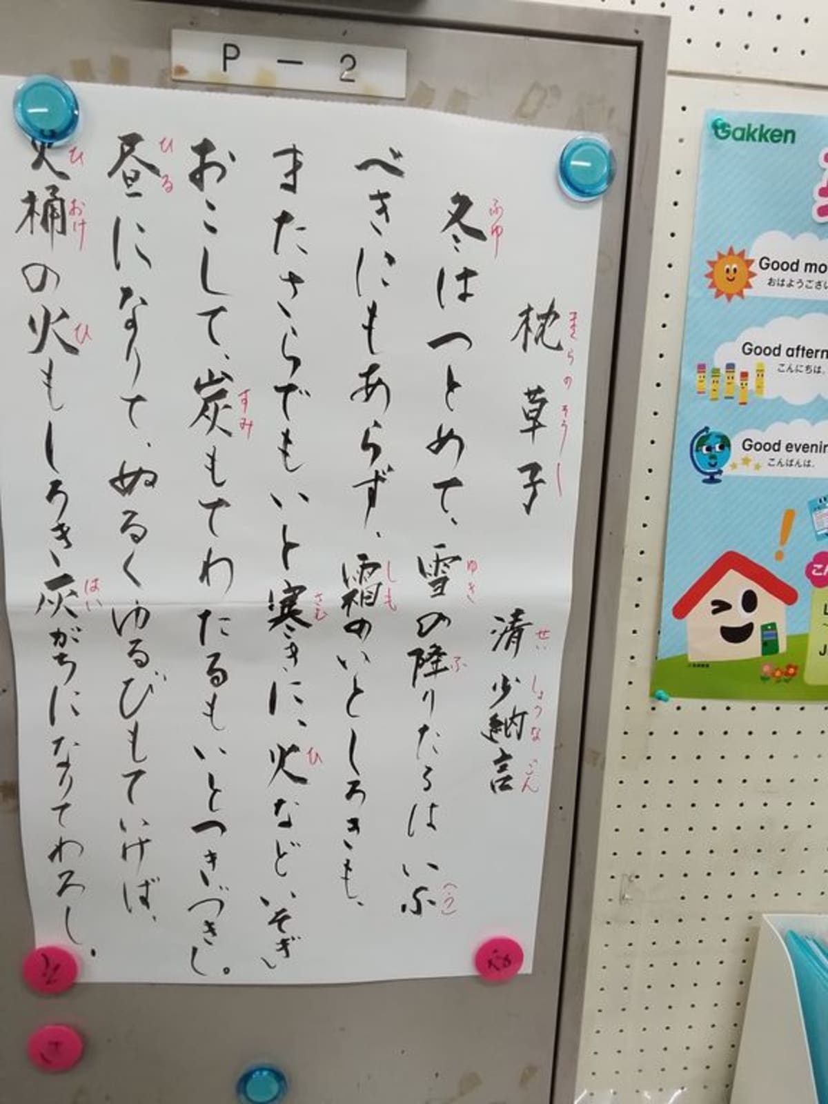 霜月です。朝晩は、寒くなってきました。落ち着いて学習出来る季節です。 くるり学研教室は、小学一年生から中三生まで一緒に学習しています。皆、自分の学習プリントに真剣に取り組んでいます。そして、学習の最後に、その月の名文暗唱をしています。覚えるのは、低学年の生徒のの方が早いようです。皆、楽しく取り組んでいます。 |