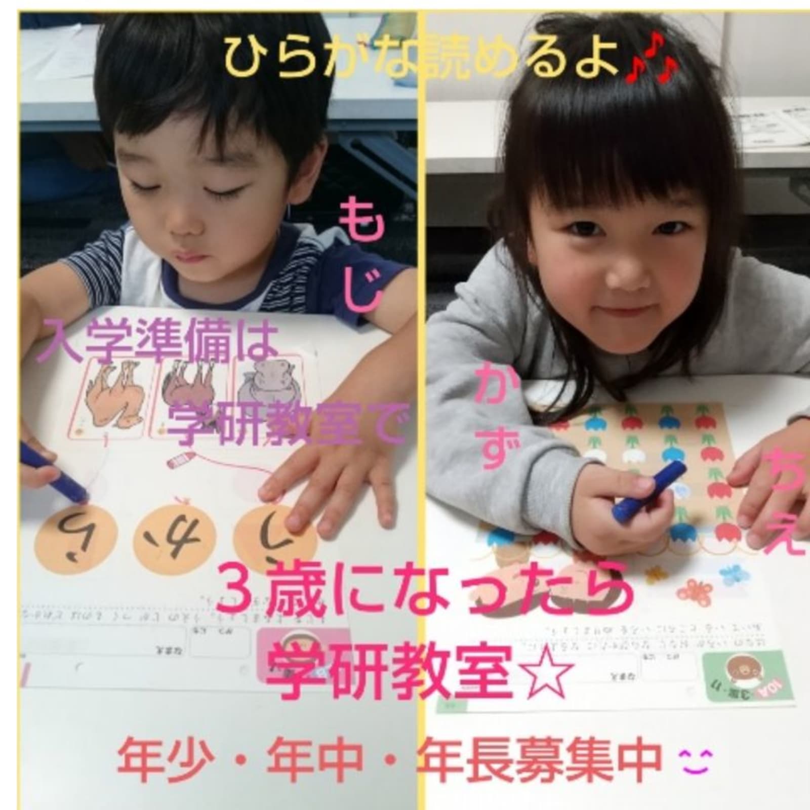☆幼児さん入学準備学習受付中♪お得な入会金0円キャンペーンは10/1~12/16までです☆ 【♪初めての習い事は学研教室で♪】 来春の入学準備に向けて、秋から入学準備を学研教室で始めましょう♪ 子ども達の「楽しい!」「もっと学習したい!」という気持ちを引き出す指導と教材で、自然と学習習慣が身に付き、小学校での学びにもスムーズに入れます♪ 小学校入学準備やお子様の教育にお悩みの際は、まずは無料体験でご相談ください♪ 小学生&中学生も無料体験実施中♪ →中3生は満席のため募集を締め切りました。 お問い合わせは、左上の黄色いバナー又はお電話からお気軽にお待ちしております♪ |