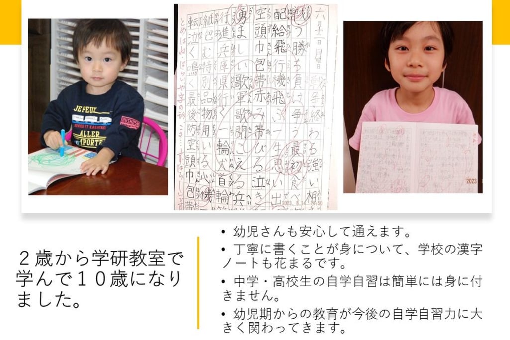 スタートが大切です。無料体験実施しております。 中学受験や難関校にも、合格の実績を上げております。 昨春「学研教室で培った自学自習の力で、国立岡山大学法学部に入学できました。」 との嬉しいご報告も頂いております。 学研教室では、診断テストを基に、一人一人に合った学習を提案します。 苦手なところはじっくり丁寧に、定着するまで取り組みます。 自学自習力を目標に基礎固めから先取り学習ができ、さらにハイレベルな学習まで対応できます。 学研教室には『思考力・判断力・表現力』を伸ばす教材があります。そんな教材に出会ってみませんか? 無料体験実施しております。 認知能力+非認知能力=生きる力を育む学研教室 |