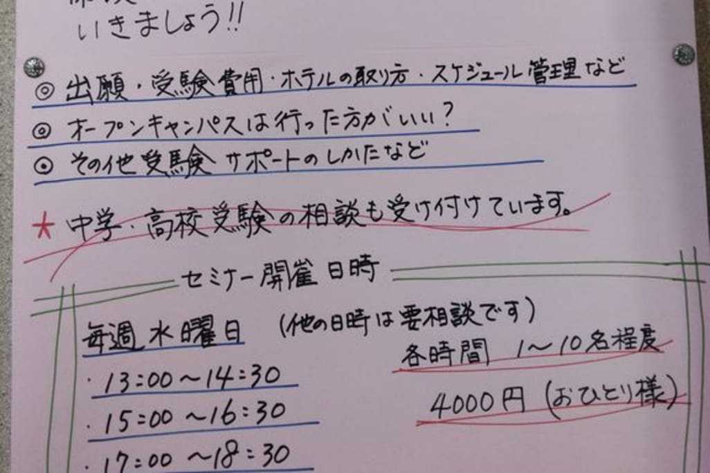 | 授業スケジュール | 月 14:00~18:00位まで / 火 14:00~18:00位まで / 木 14:00~18:00位まで / 金 14:00~18:00位まで |