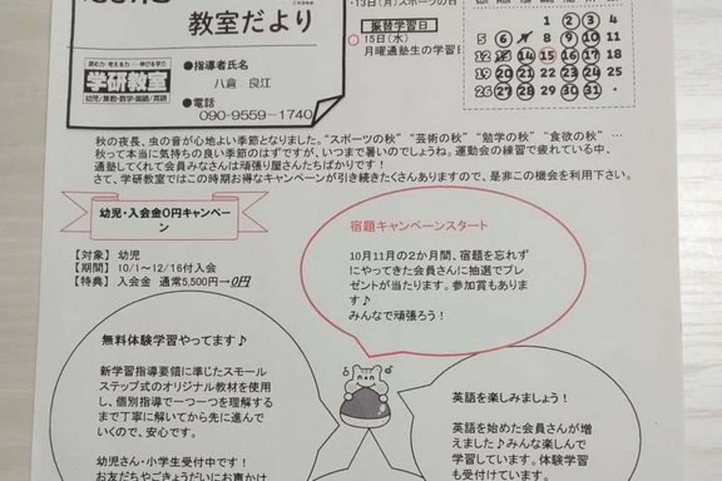 秋の無料体験学習、入学準備学習 受講者募集中。 スポーツの秋,芸術の秋,食欲の秋,実りの秋…暑さから解放されてお勉強にも取り組みやすい季節となりました。 学研別府教室では秋の体験学習の受講者を募集中です。先ずは、診断テストで今の学力を確かめましょう。その結果に基づいて、一人一人に合ったプランをご提案致しますのでご安心頂けます。ぜひこの機会にお試しください。また、入学準備学習をご希望の幼児さんも大募集です。お勉強をスタートするのに早すぎるはありません。興味津々の時期は、様々なことを楽しんでどんどん吸収しますので、お子様の大きな成長を実感できて嬉しくなりますよ。小学校入学までに必要な力をゆっくりと備えましょう。 お気軽にお問い合わせ下さい。 |