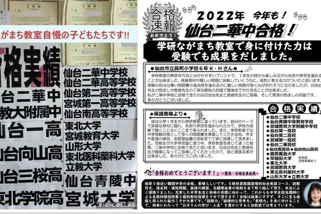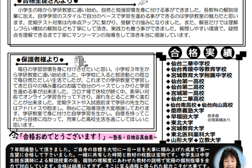 学研教室の指導を20年続けていますが、学び続けることの大切さを今ほど感じる時はありません。 無学年方式で一人一人を大切にし、自分で考える力を身につけられるように指導しています。わかったつもりの記憶は忘れてしまいますが、理解した知識は忘れません。一人一人の学力に応じた最適な教材を与え、適切なアドバイスをする事で自分から進んで学習する態度や能力を育てます。子ども達に学ぶ喜び・自信・生きる力をつけてもらいます。仙台二華中合格、青陵中合格、宮城教育大附属中合格、一高二高合格などの合格実績があります。公立中高一貫コースなど受験にも適した教材やコースも用意しております。