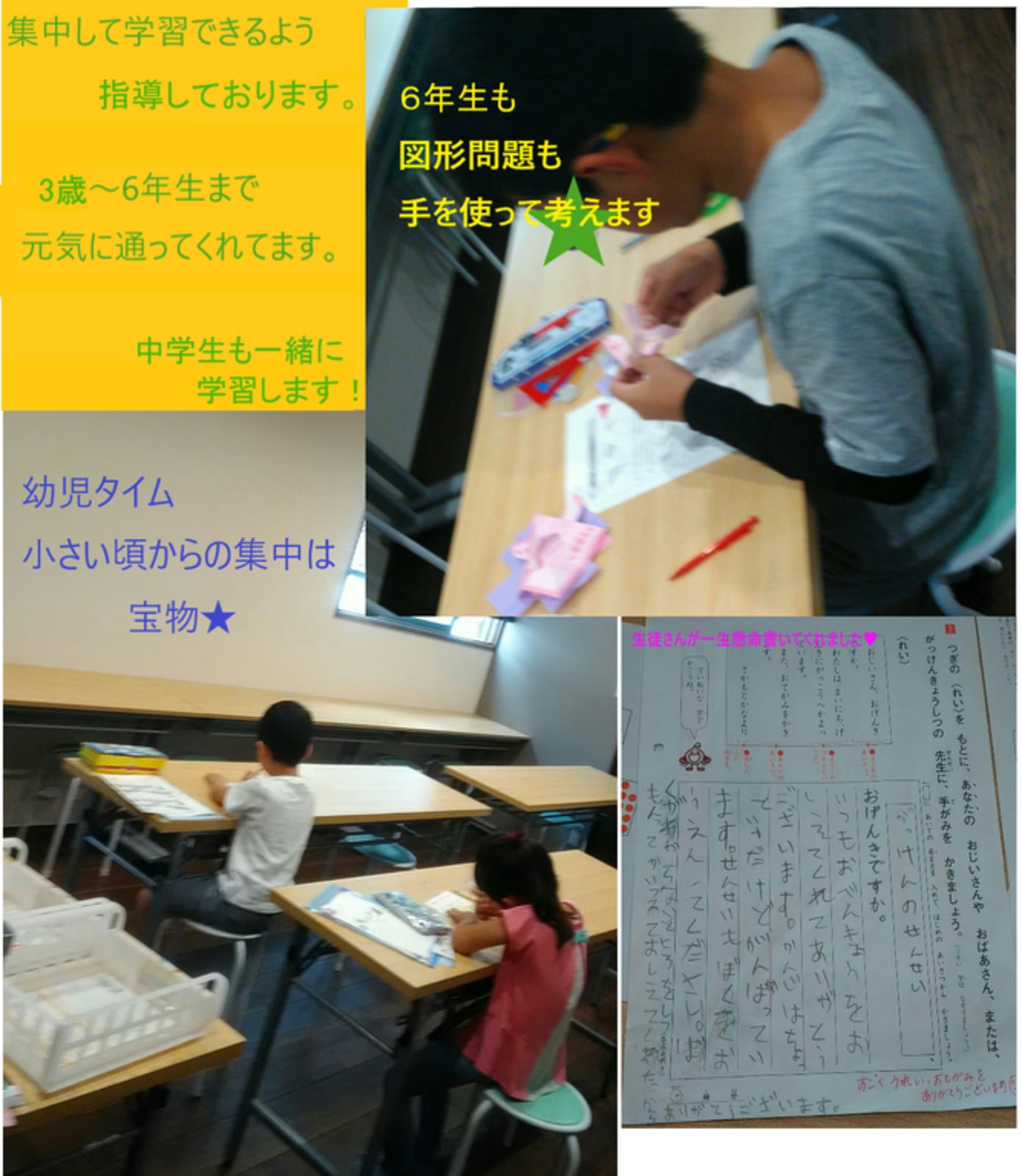 北っ子・尾久っ子♪3歳からの学研教室♪ご入会ぜひ!☆優秀指導教室★無料体験★お申込みは必ずHPより♪ 秋!学校・園も始まりました。非認知能力アップさせて、学びを深めていきましょう! ●年長☆入学準備☆ぜひ! ●幼児タイム☆まだ字が読めなくても、毎日のお勉強を習慣確立☆ぜひ! ●小学生☆進学準備・苦手克服、学習習慣確立 ★募集★空席あり ※週一ハイブリッド相談 お子さま一人ひとりに合わせた丁寧な指導をしております。教室では、先取りが進むお子さま、今までの復習を頑張るお子さまが、日々頑張りとても成長してます。特に、幼児から継続した一年生の非認知能力UPに目を見張ります。 年度後半は学習も深くなり、定着も大変!でも尾久北っ子はみんな頑張っています。 是非ご入会お待ちしてます。 |