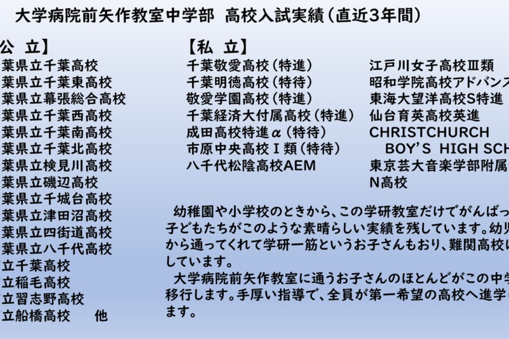 子どもに寄り添い、自主性を育てる受験指導を行っております。 「学研」と聞いて、進学塾のイメージを持つ方は少ないと思いますが、大学病院前矢作教室からはたくさんの中学生が希望する高校へ進学しています。 試験対策はもちろん、内申対策、高校選択のアドバイス、手帳を使っての自己管理の徹底など、子どもたちが自分自身で乗り越える受験をとことんサポートいたします。 幼稚園や小学校のときから、この教室だけで頑張ってきた子どもたちが素晴らしい進学実績を残しています。また、幼児から通って学研一筋というお子さんが難関高校に合格しています。 高校コースも併設しており、スムーズな高校生活への移行もお手伝いできるようにしています。 |