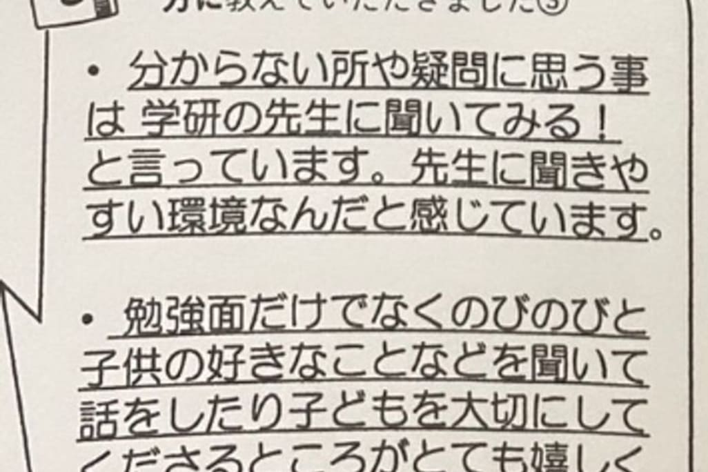 学研教室の先生はみな、指導のプロ。「子どもたちに学ぶ喜びを」 「自信を」 「生きる力を」という共通の理念のもと、子どもたち一人一人と向き合っています。学習のスタートは、その子のできるところから。良いところを見つけ、ほめながら、ゆっくり、じっくり、ていねいに学習をサポートしていきます。わからない問題があったら、考え方を示し、ヒントを与え、子どもが自分で考えてわかるように導くので自分で考えて課題を解決する力が身につきます。また、お子さまの様子や学習状況を保護者の方へていねいにお伝えします。指導者は最新の教育情報にも精通しており、学習相談や教育相談にもお答えします。