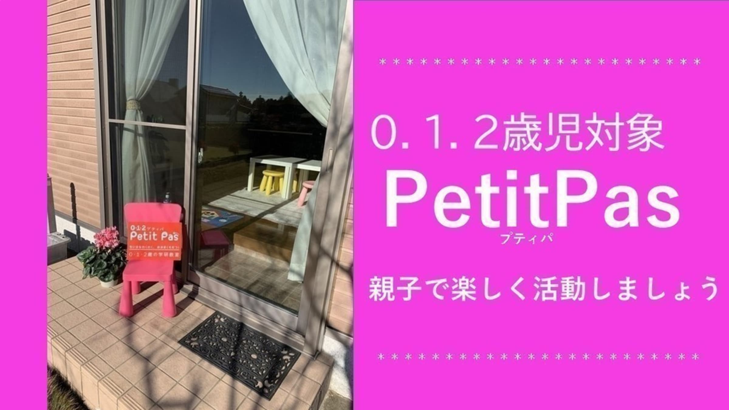 0.1.2歳さん向けPetitPas参加親子募集中! 0.1.2歳さんの親子で参加型のPetitPas(プティパ)も参加者募集中。少人数での開催ですので日時は、ご相談の上決めましょう♪お友達同士も大歓迎です。 |