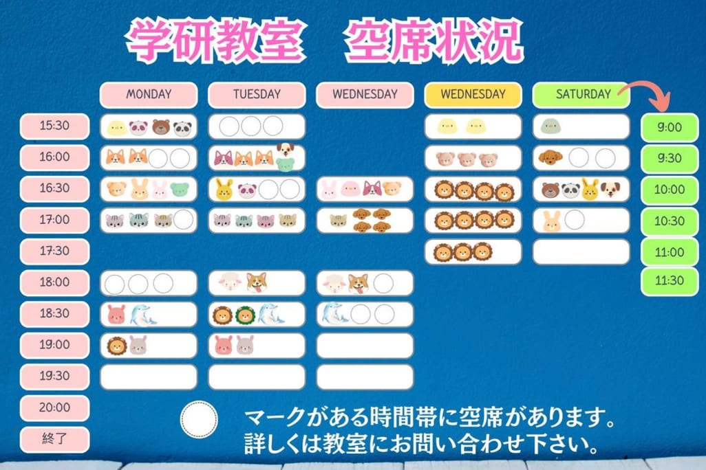 | 授業スケジュール | 月 15:30~20:30位まで / 火 15:30~20:30位まで / 水 15:30~20:30位まで / 土 10:00~12:00位まで |