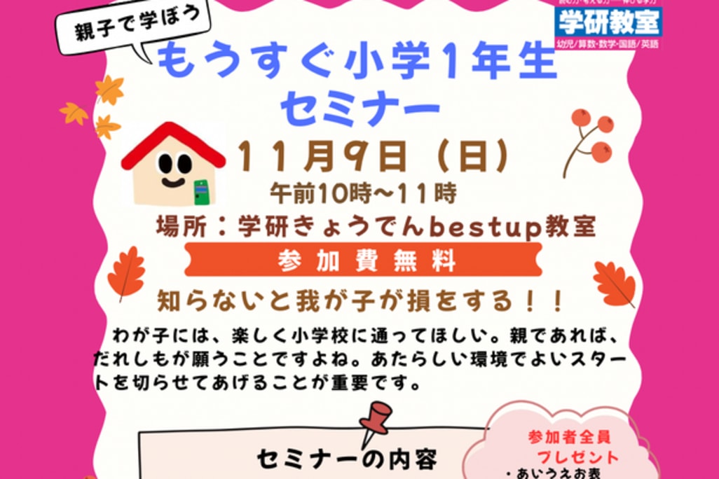 もうすぐ1年生セミナー 11月9日(日)午前10時~11時 きょうでんbest up教室にて、年長さん対象でもうすぐ一年生セミナーを行います。 内容:鉛筆の持ち方 ひらがな・カタカナ講座 プレ1年生の時計講座 「しょうがっこうがだいすき」の読み聞かせ 参加料無料、親子で参加ください。プレゼント付き ※無料体験は随時受け付けています。 |