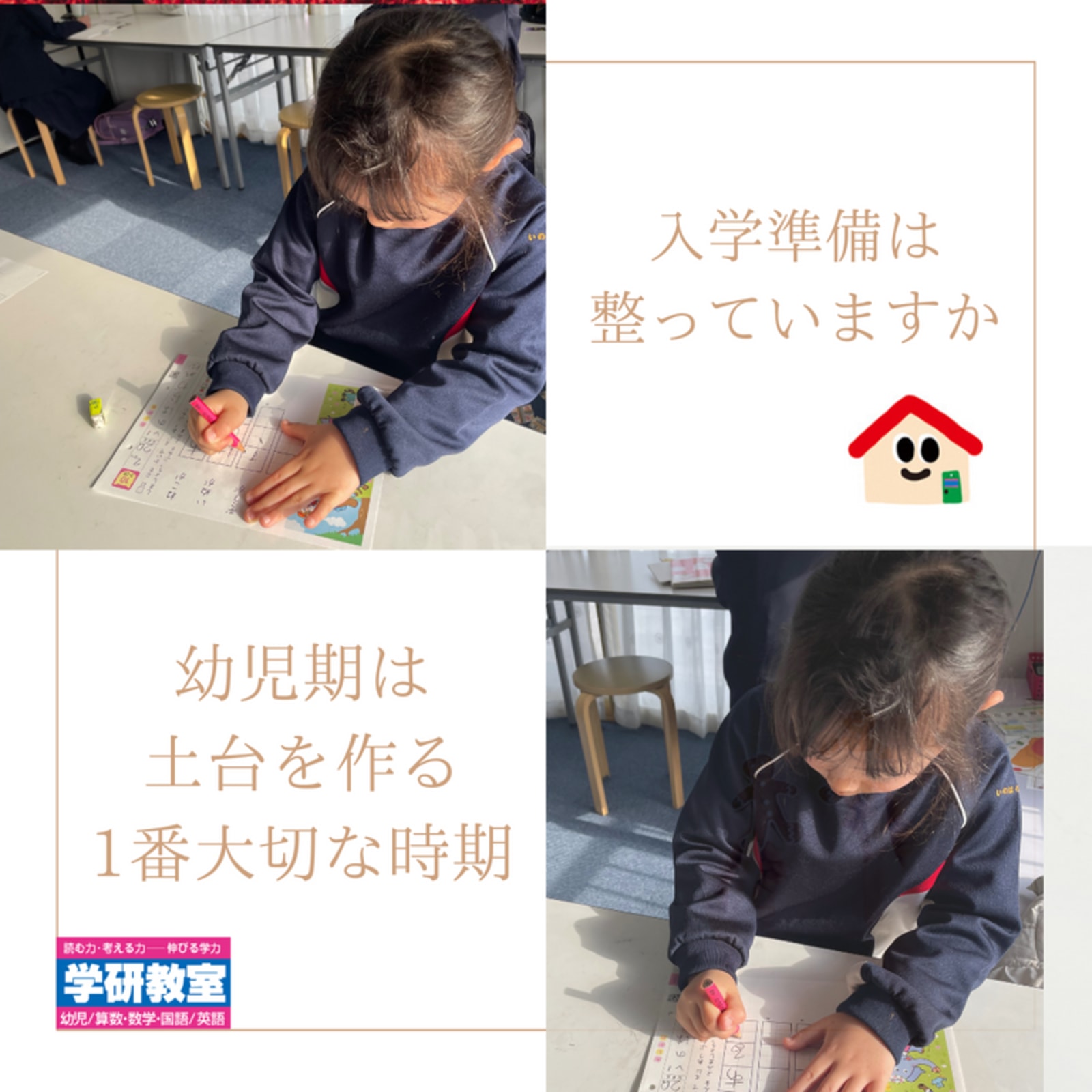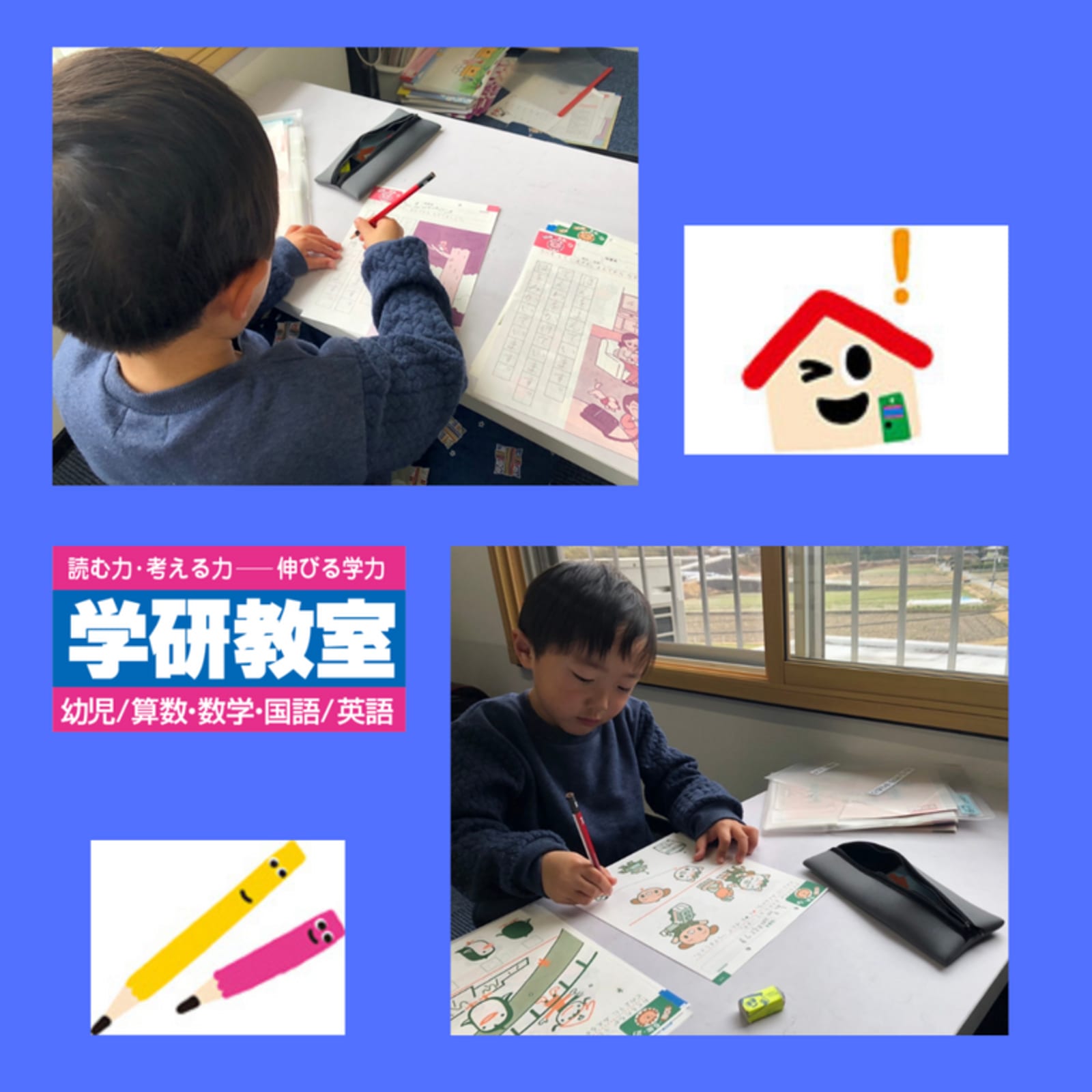 秋の無料体験学習実施中です。 お気軽にお問い合わせください。 ●【幼児さん】小学1年生の土台作りを今からはじめませんか? 土台作りは幼児期が大事な時期です。 まだ、早いではなく、もじ、すうじは、早くから楽しく、正しく学ぶことで、小学校に入ってからの学習がスムーズに進みます。 小学校に入ると環境も変わり、覚えることもたくさん。そんな忙しい毎日に加えて、新しい字や数字を覚えていくので大変です。 幼児期に1年生の内容を幼児教材で学ぶので、余裕をもって取り組むとができます。 ●【小学生】二学期は学習進度が早くなります。基礎から学べる学研教室ではじめませんか? お子さま一人一人の学力に合わせた教材だから安心です。 毎日の学習習慣をつけ、自ら学ぶ力をつけられます。 |