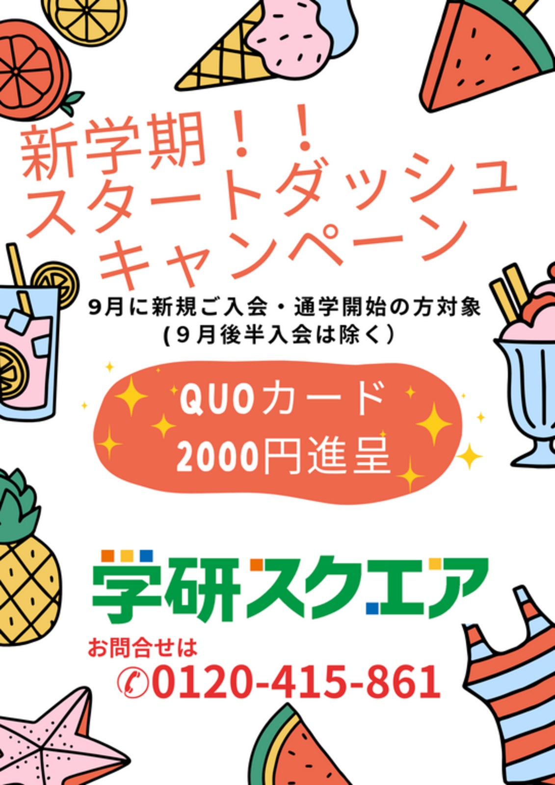 10月1日~12月16日ご入会の方に特典あり! (幼児の方)入会金5,500円を免除! この機会に、ぜひ、ご入会ください!! ☆☆☆ 幼児・小学生/英語コース・算国コース無料体験レッスンご予約受付中! ☆☆☆ 日時等、詳細お問い合わせは 0120-415-861まで お問い合わせお待ちしております。 |