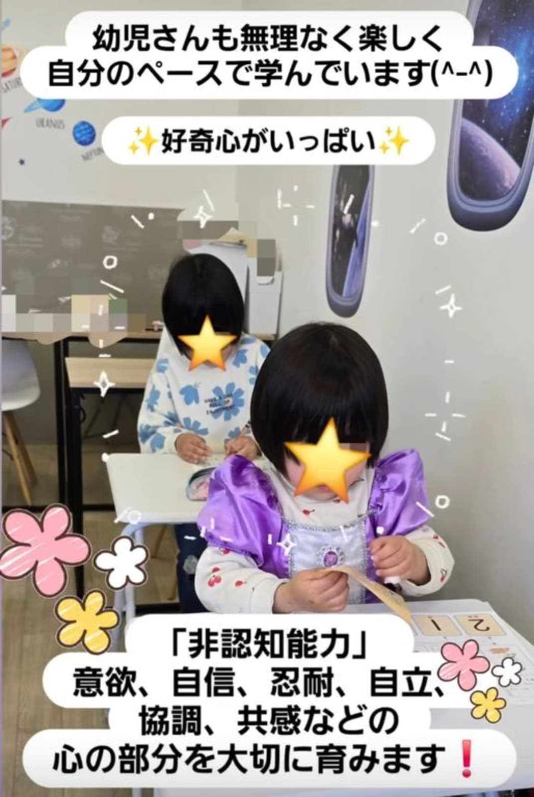 ★学ぶことは楽しいことばかりではありません。途中で挫折しそうになる事もあります。しかし困難を乗り越えやりきった先には素晴らしい景色、未来が待っています。お子様のやってみたい!を応援し可能性をみつけるお手伝いをさせて頂きます。安心安全な場所で楽しく学べ入園入学準備をサポート!