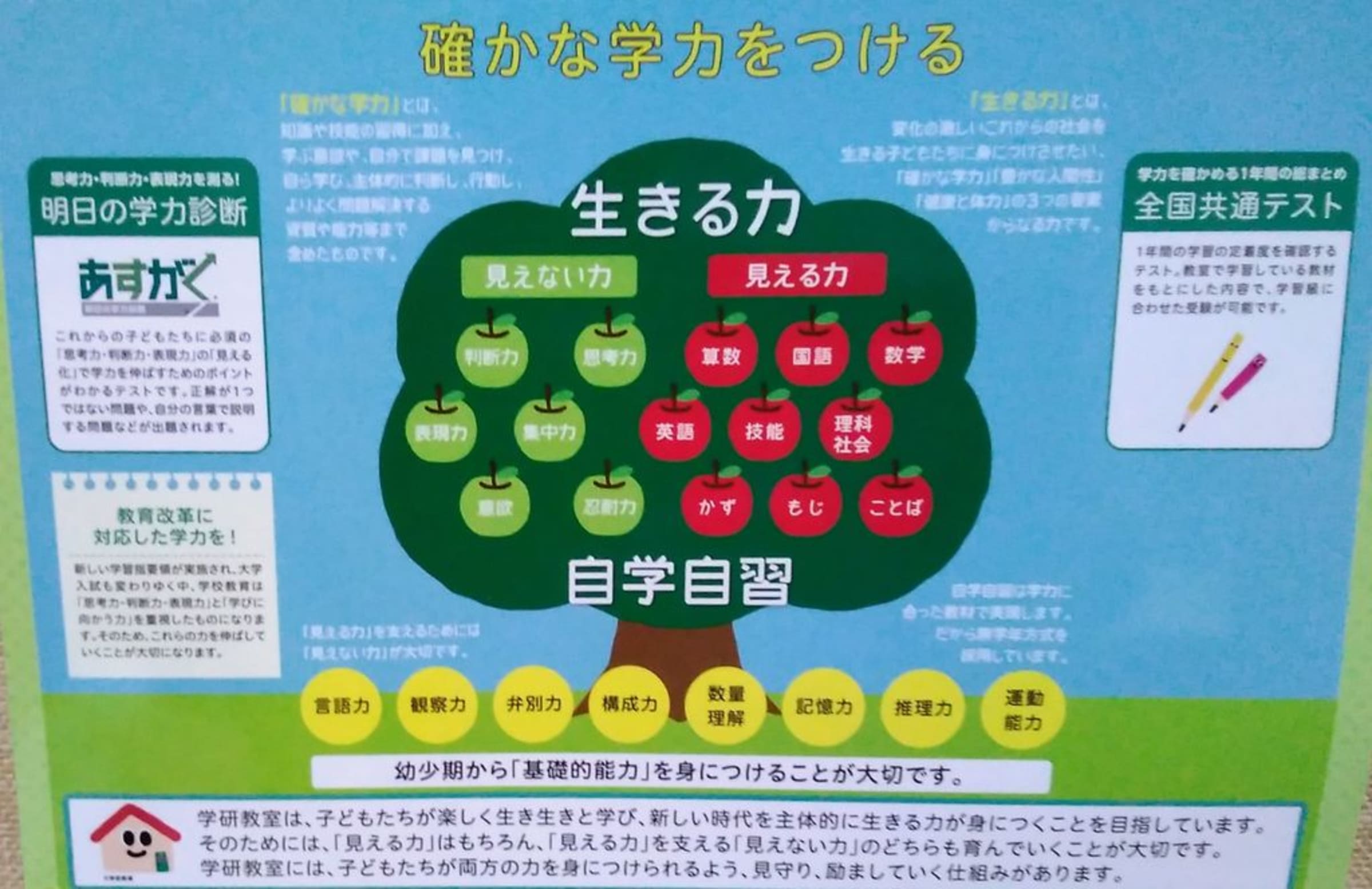 やっと勉強の秋、読書の秋 十月も半ばになり、やっと秋めいてきました。来週末には学芸会、運動会という学校も多いことでしょう。ところがインフルエンザで学級閉鎖というニュースも聞かれます。うがい、手洗いを忘れずに、寒暖差にきをつけて、味覚の秋、芸術の秋も楽しみましょう。 西霧が谷公園前の当教室では、お一人おひとりに合わせて、今、お子さまに必要な教材を準備して、多くのできる、わかったの声を楽しみにしています。 認知能力+非認知能力=生きる力も学研教室で育みませんか。 |