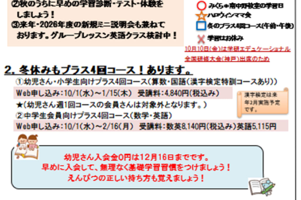 11月14日(金)午後1時から終日教室オープン見学会をします! 幼児さん入会金0円は12月16日までです。 11月14日は午後13:00から最終入室18:00まで入退室時間自由で教室オープン見学会をします。 事前にご希望のお時間等必ずご予約ください。(ショートメッセージでも可) 当日ご参加いただいた幼児さん限定で学習に集中できる「学研オリジナル学習マット」をプレゼントします。 お問合せも混みあってきました。ご希望の通室曜日・時間がある方はお早目に山田までご相談くださいね。 インスタグラムも始めました!是非ご覧ください。 2026年「英検合格コース」開講予定。詳細は山田まで。 中学生コースは火曜日、金曜日通室ならば一名欠員募集します。 |