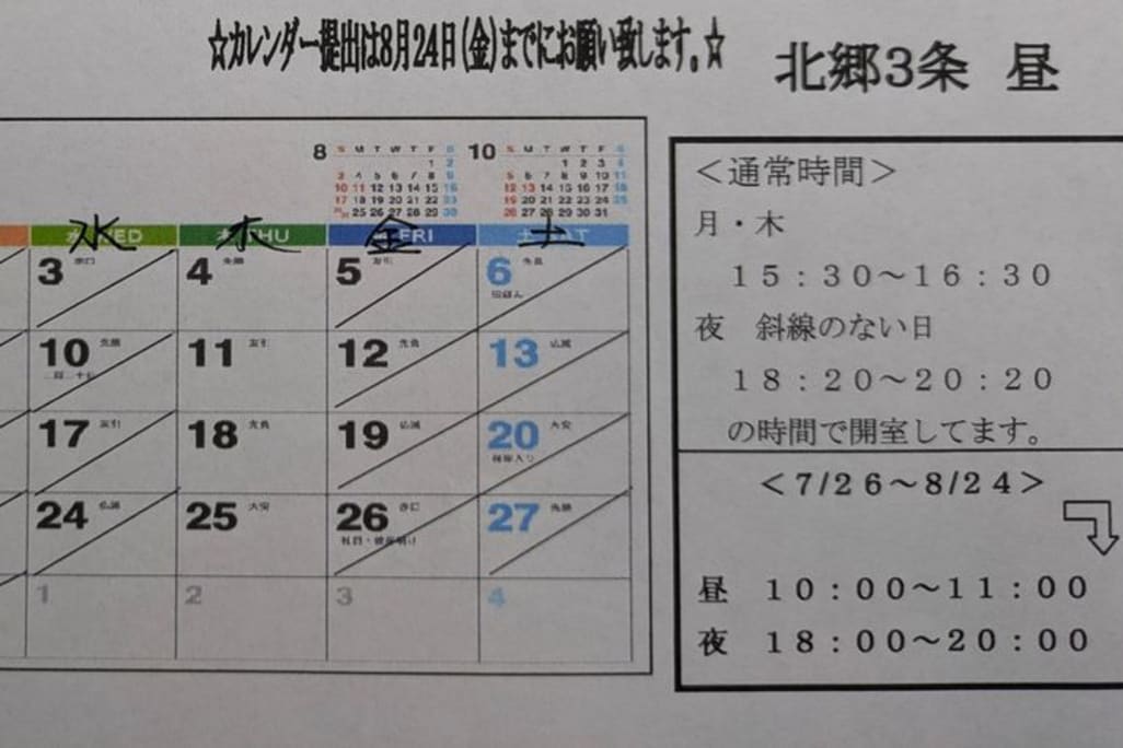 北郷3条北都教室は5教科対応。幅広い区域から子どもたちが通ってきています。年少~中3が対象:開室時間:月・木3:30~4:30夜は月~金①18:20~19:20②19:20~20:20①か②を選択。国語と算数の2教科で約1時間☆子どもに合わせたオリジナル教材で個別指導。月8回:昼夜両方通えます。ライフスタイルに合わせられます。小中学校教員経験15年、(心理カウンセラー、図書館司書教諭資格所持)冬はスキー指導員・A級検定員で活躍中☆小学校は立命館・教育大附属。中学校は開成・大谷や各中学・高校受験毎年合格者続出してます。夜は小学生に大人気!保育園児も週1回来て頑張っています。相談しながら通えます。