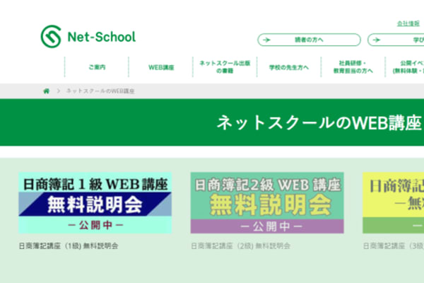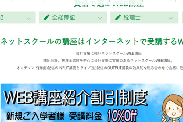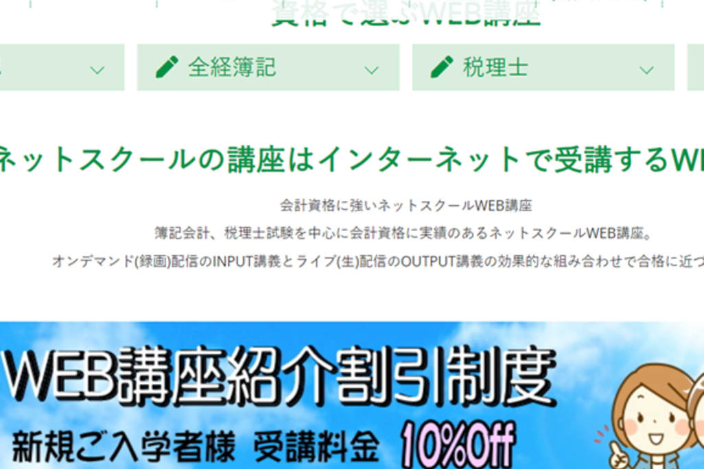 会計資格に強いネットスクールWEB講座は、インターネットさえあればいつどこでも学習できます。運営は、簿記・税理士など、ビジネス資格対策について書籍・WEBによるサポートサービスを展開しているネットスクール株式会社です。簿記会計、税理士試験を中心に会計資格に実績のあるスクールなので、安心して学べます。