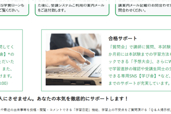受講生専用SNS「学び舎」を利用できます。「学び舎」とは、受講生同士のコミュニケーション機能や学習記録等がつけられる受講生専用のSNSです。ここにあるQ&A掲示板では、他の方の質問の閲覧・投稿ができ、学習していく上での不安解消や、モチベーション維持に役立てられます。