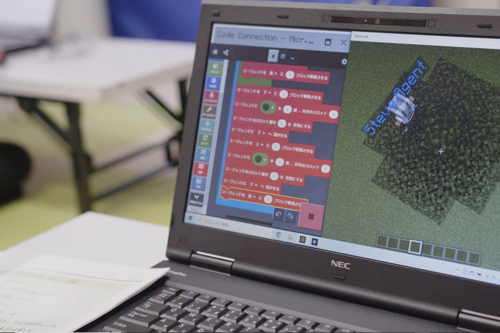 Microsoft社が運営する世界中で大人気の「マインクラフト」を使用したコースとなっており、プログラミング教材として活用することで、学習効果にも期待が高まってきています。