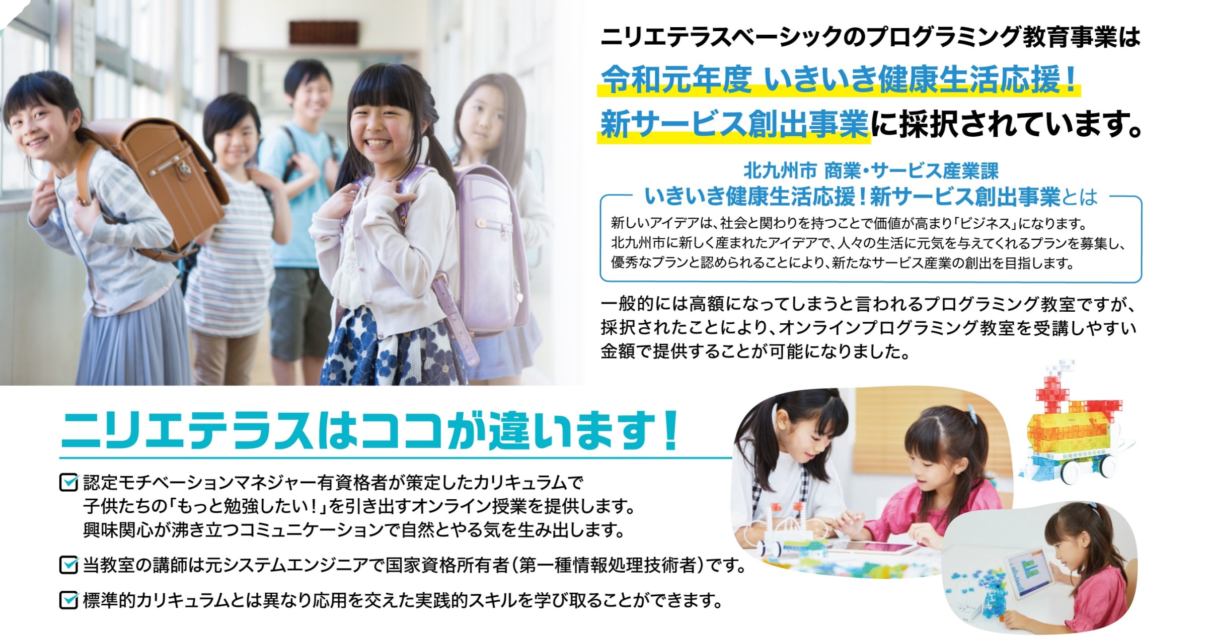 | 備考 | ●はじめてのプログラミング体験に プログラミング初級者にはSONY製学習教材toioの「GoGoロボットプログラミング」を使用します。 はじめてのロボットプログラミング体験に最適です。 「GoGoロボットプログラミング」はかわいいロボットが絵本の上を楽しく動き、実際に動く様子が見えます。 視覚でプログラムの働きを体感でき、プログラミング初級者にとってtoio「GoGoロボットプログラミング」はとても優れた教材です。 ゲーム感覚で進めることで自然とプログラムの三つの基本構造「順次、分岐、反復」をしっかりと身につけることが出来ます。 ●本格的なビジュアルプログラミングを学ぶ 「KOOV」で創造力を刺激しよう KOOVはロボット製作とビジュアルプログラミングの体験を通じて、子どもたちの創造性や探究心、思考力を育みます。 標準の学習プログラムだけでなく、ニリエテラス式プログラミング教室オリジナルのステップアップ課題を準備しています。 これにより一つ一つの課題に対する学びが深くなり応用力が身に付きます。 ●目標を持って学ぶ! ジュニア・プログラミング検定はプログラミングを学ぶ子ども達を対象とした資格試験です。 「Scratch」を使用したプログラミングスキルを測定し、その能力を証明・認定します。 ニリエテラス式プログラミング教室ではビジュアルプログラミングを学ぶことの目標の一つとして資格試験を取り入れています。 ●アイデアを形にできる IoT ブロック「MESH」 MESH(メッシュ)は「Make、Experience、SHare」の略。 作り、体験し、共有する。 ニリエテラス式プログラミング教室では上級編講座に「MESH」を活用します。 これにより実生活において「困ったこと」や「あると便利なこと」を考えプログラミングで解決させます。 |