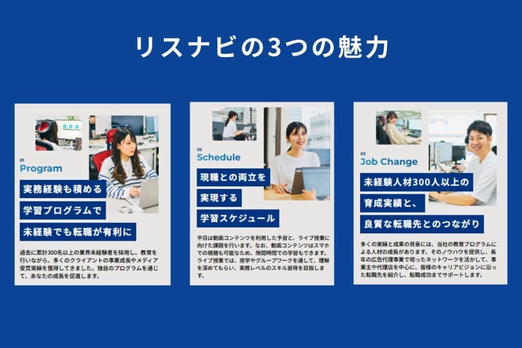 「未経験からWebマーケターになりたい」「実践的なスキルを身につけて転職・副業を成功させたい」とお考えの方は、ぜひリスナビ マーケタースクールの受講を検討してみてはいかがでしょうか。