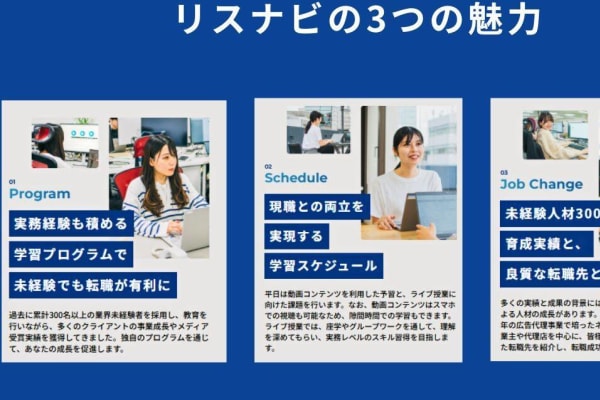 リスナビ マーケタースクールは、Webマーケターとしての転職や副業を目指す方に特化したオンラインスクールです。