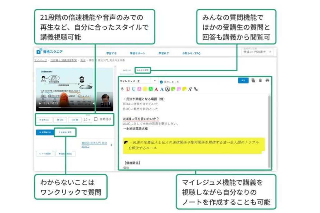 資格スクエア 行政書士講座では講義視聴から問題演習までオンラインで完結します。動画視聴は21段階の倍速機能や音声のみ再生などが可能です。