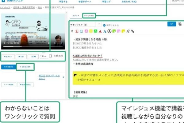 資格スクエア 行政書士講座では、不明点を有資格者が答えるワンクリック質問機能を利用できます。