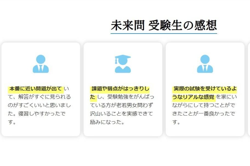資格スクエア 未来問宅建模試は自宅でいつでも受験できます。オンラインの一斉受験にも対応しています。