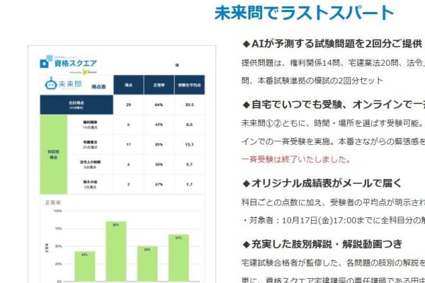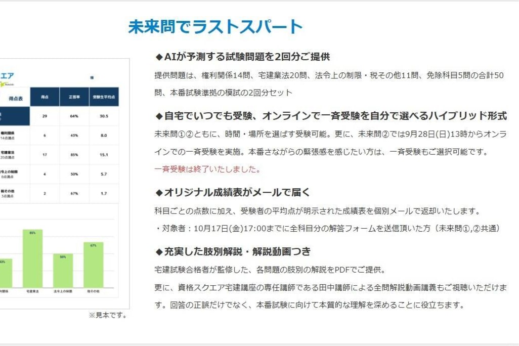 未来問宅建模試は全問解説講義と個別成績表付きです。