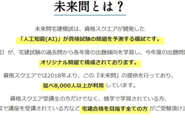 未来問宅建模試は「人工知能(AI)」が資格試験の問題を予測する模試です。