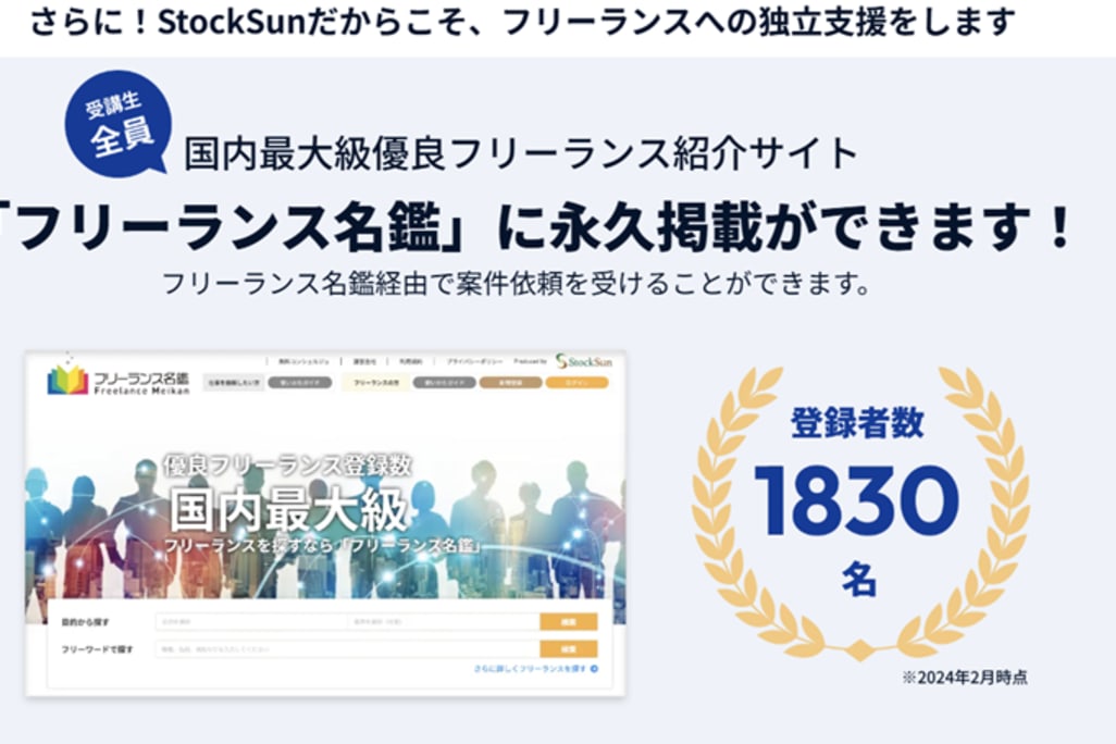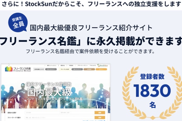 発注実績が豊富なStockSunが監修、認定パートナーが講師をしているスクールのため、スクール受講によりフリーランス・副業の現場で通用する即戦力が身につきます。