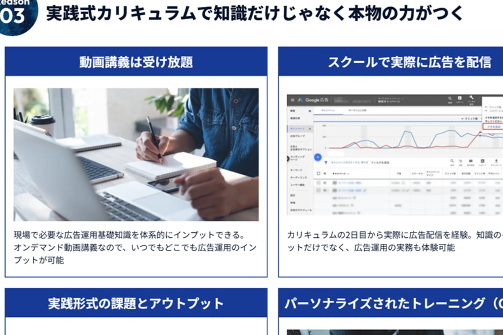 短期間でスキルを定着させるには、アウトプットの回数を増やすことが大切です。StockSun広告運用道場のカリキュラムは、アウトプットを重要視しています。カリキュラムは、実際の数値をもとに作られた課題を採用しており、取り組むことで着実にスキルアップを目指すことが可能です。