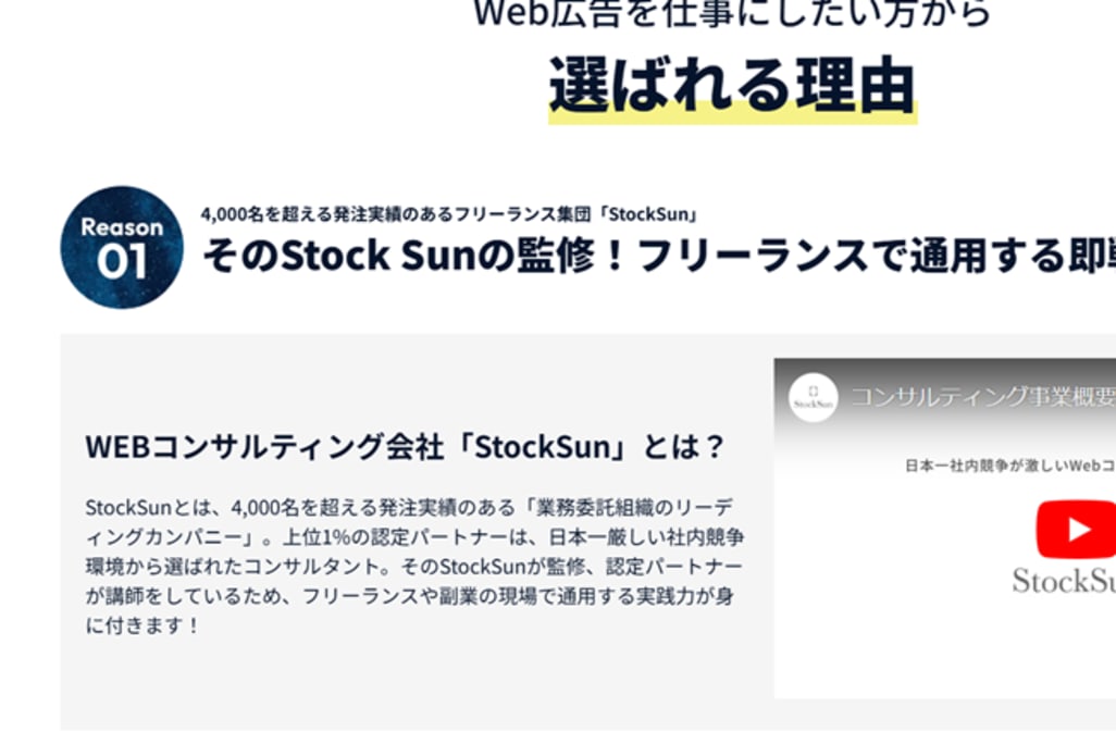 スクールを運営しているのは、4,000名超の発注実績のあるフリーランス集団「StockSun株式会社」です。上位1%の認定パートナーは、日本一厳しい社内競争環境から選ばれたコンサルタントのみ。確かな実力をもつコンサルタントが講師を務めているので、安心してカリキュラムを受講できます。