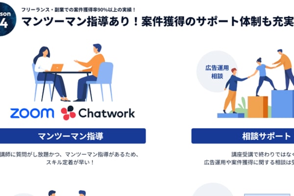 講師は、運用・案件獲得に強い現役のWEBマーケーターのみ。実績豊富な講師から学べるので、確かなスキルが身につきます。スクールでは、目標設定~学習計画や進捗サポートなど、途中で挫折しないためのコーチングを受けることができます。