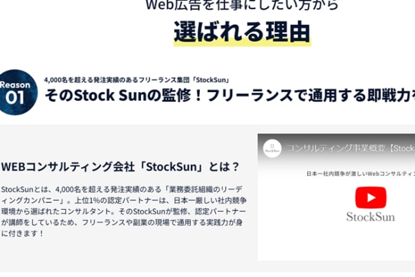 そのような悩みに応えてくれるのが、未経験から即戦力が身につくWEB広告運用特化型スクール「StockSun広告運用道場」です。