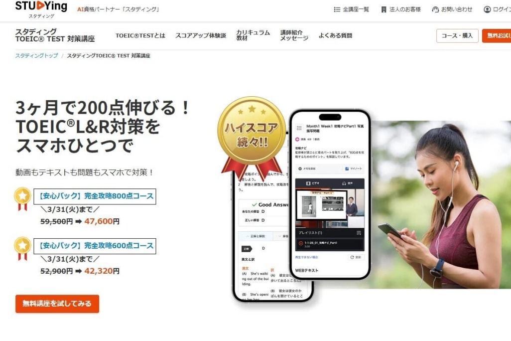 スタディング TOEIC講座は、忙しい方が着実にスコアアップを目指せるカリキュラムや教材が魅力です。