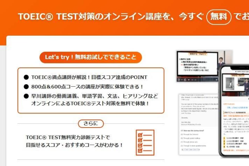 はい。スタディング TOEIC講座では、無料体験が提供されています。また、無料の実力診断テストでおすすめのコースや目標にするのにぴったりなスコアもわかります。
