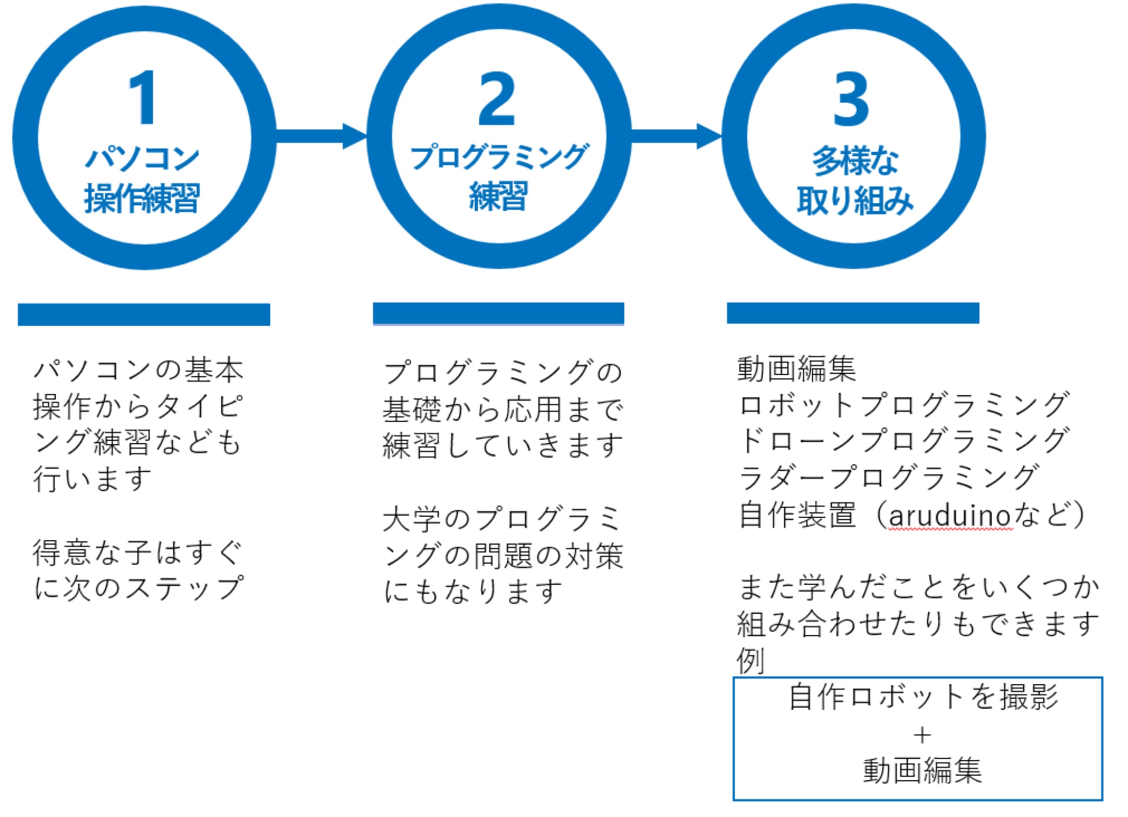 | 対応コース | ゲーム制作 プログラミング ロボット ビジュアルプログラミング タイピング ITリテラシー 動画制作 デザイン パソコン・ICT教育 電子工作 STEM・STEAM教育 |