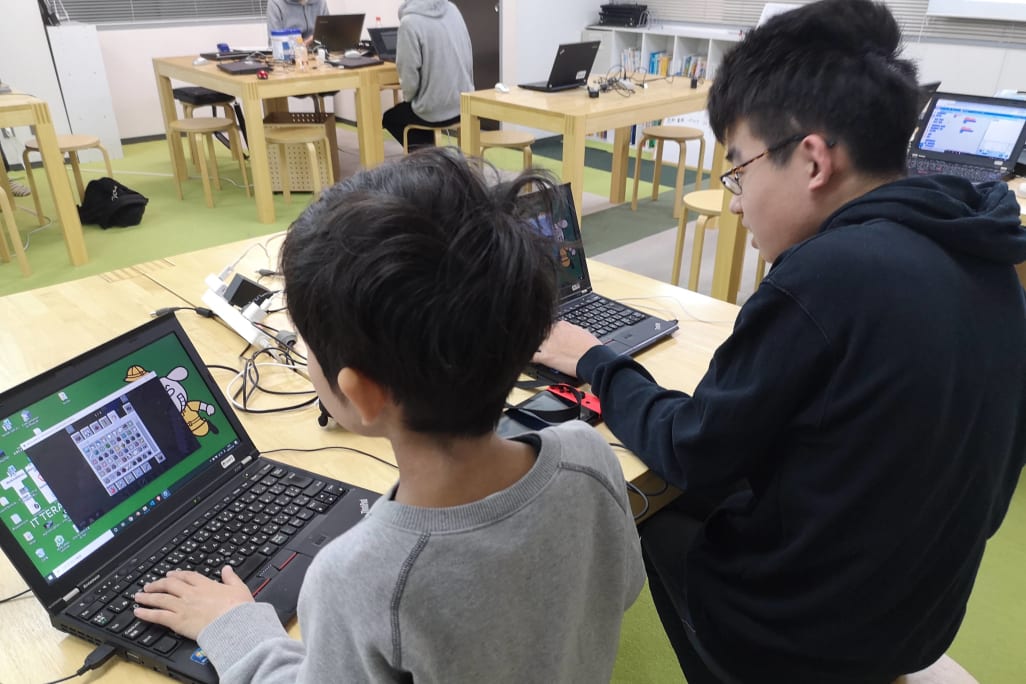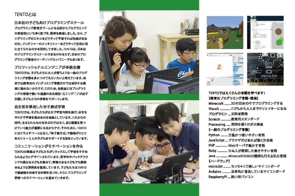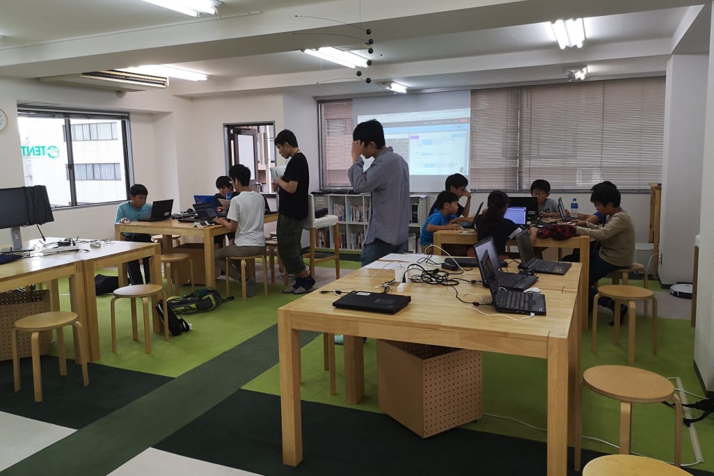 TENTO(テント)は、なかなか珍しい寺子屋方式で学べるプログラミング教室。2011年の創業時から一貫して、それぞれの興味に合わせた課題を自ら選択、自ら作品づくりに取り組んでいけるこのスタイルを取っています。コエテコでは実際に取材を行ったのですが、先生が細かく指示しなくとも、バリバリパソコンに向かっていく姿は圧巻!「タイピングも初めて」というお子さんもいれば、大人が仕事で使うようなプログラミング言語を、英文ドキュメントを読みこなしながら書いていく生徒さんもおられました。現役エンジニアが講師を務めるTENTOならではの光景と言えますね。