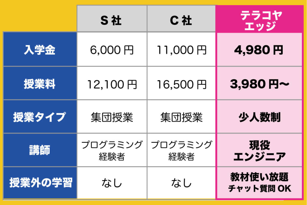 | 備考 | ・無料体験授業 ・【今だけ】30日間レッスン無料 ・少人数制レッスン ・現役エンジニア対応 ・授業外でも質問し放題 ・授業外でも映像教材使い放題 ・兄弟割あり |