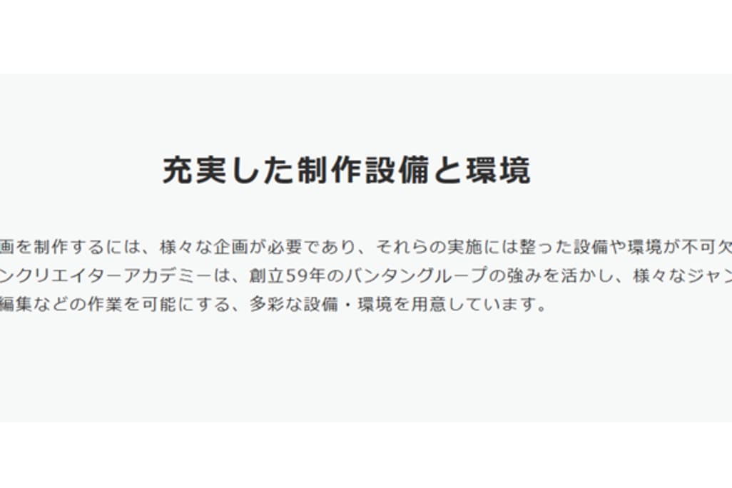 魅力的な動画を制作するには、様々な企画が必要であり、実施には整った設備や環境が不可欠です。バンタンクリエイターアカデミーは、創立59年のバンタングループの強みを活かし、様々なジャンルの動画撮影や編集などの作業を可能にする、多彩な設備・環境が揃っています。