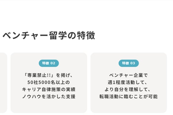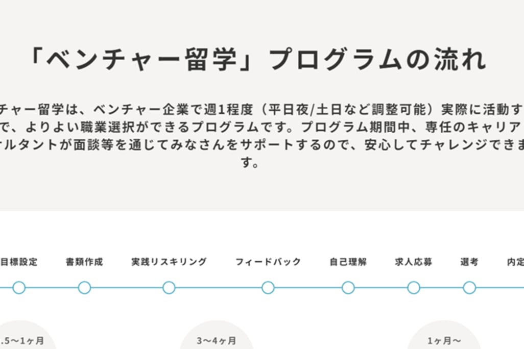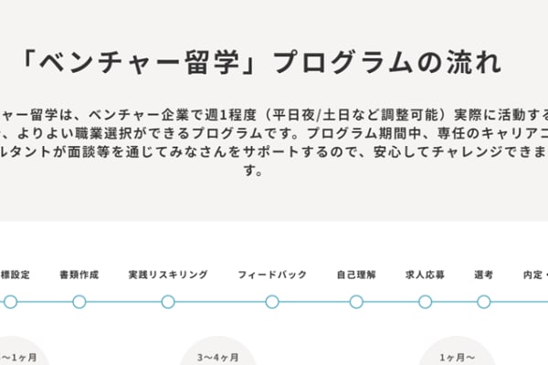 ベンチャー留学は、ベンチャー企業で週1程度(平日夜/土日など調整可能)の実践経験を通じて自分の強みや可能性に気づける、または職業選択ができるプログラムです。プログラム期間中は、専任のキャリアコンサルタントからサポートを受けられるので、安心して新たな仕事にチャレンジできます。書類選考では、ベンチャー留学に必要な書類の作成、アドバイス、面談2回を受けられるので、ベンチャー未経験でも安心です。