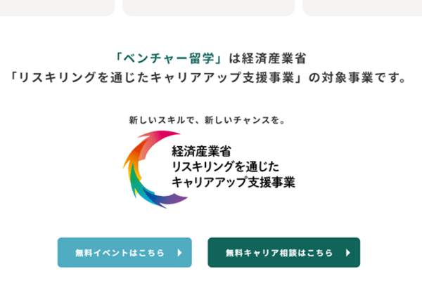 「ベンチャー留学」は、経済産業省「リスキリングを通じたキャリアアップ支援事業」の対象事業です。事業に採択された補助事業者のリスキリング講座を修了することで、受講料の50%、受講後転職をして1年間就業することで受講料の20%の給付を受け取れるのでお得です。