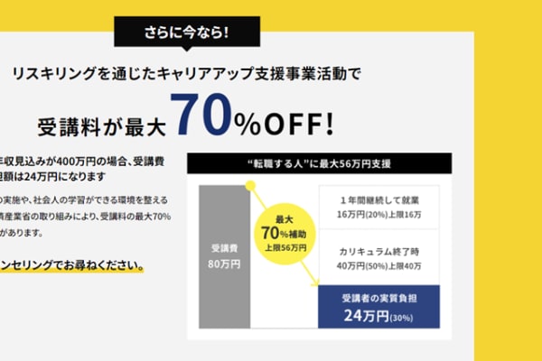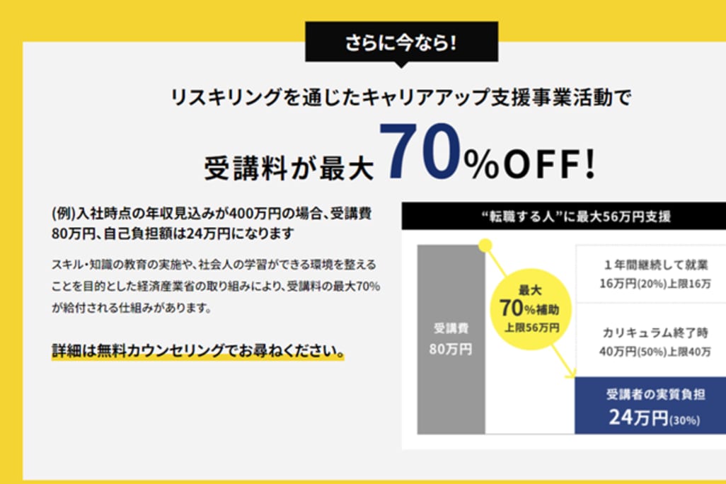 WorX ENGINEER CLASSの料金体系は、受講期間中の実質負担が0円で、転職成功後に給与額面の10%を24ヶ月間にわたってお支払いする後払い型です。転職が成功しない場合、受講料は一切発生しないため、リスクを抑えた学習が可能です。また、リスキリングを通じたキャリアアップ支援事業により、受講料が最大70%OFFになる支援制度もあります。例えば、入社時点での年収見込みが400万円の場合、受講費80万円のうち、自己負担額は24万円に抑えることができます。