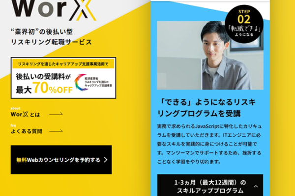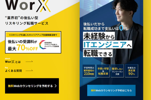 WorX ENGINEER CLASS(ワークスエンジニアクラス)は、ITエンジニアを目指すための総合的な学習とキャリアサポートを提供する無料プログラミングスクールです。未経験者でも、最先端のスキルを短期間で習得し、実践的なプロジェクトを通じてスキルを強化することが可能です。学習プログラムは、最新のテクノロジーと実践的な開発手法に基づき、実務に直結するカリキュラムが特徴です。さらに、キャリアコーチングや求人紹介、転職保証までサポートする点が、このプログラムの大きな魅力となっています。