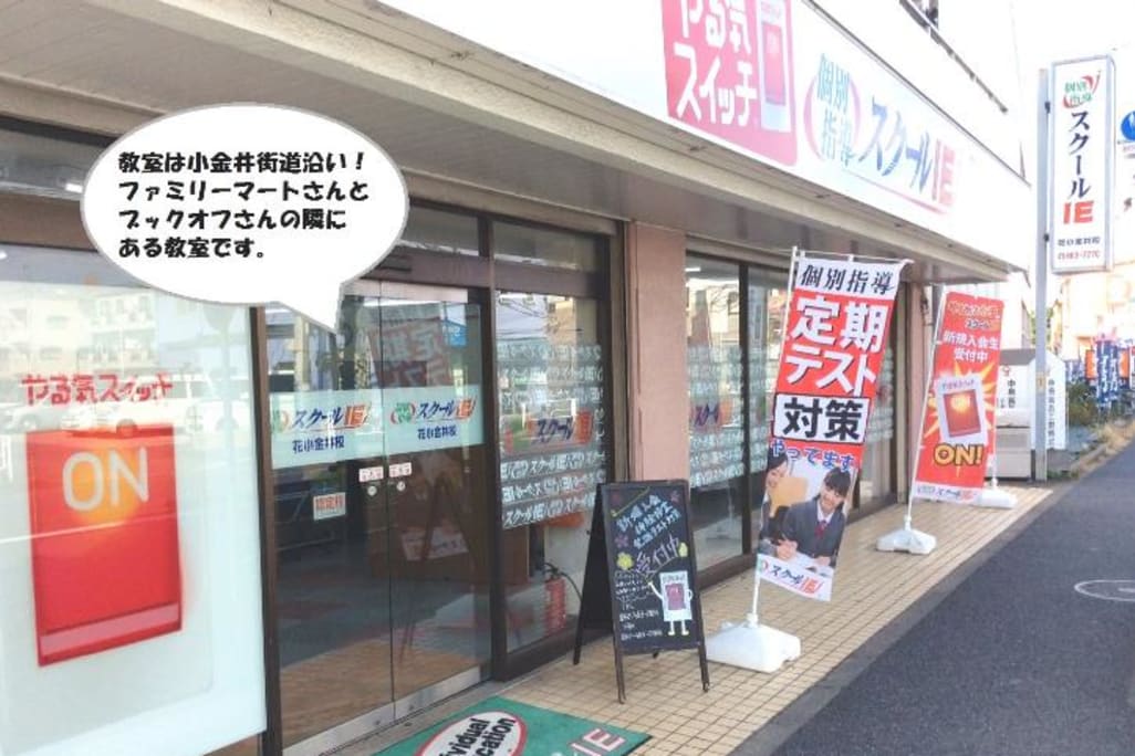西武新宿線 西武新宿線 花小金井駅 スクールIE花小金井校は西武新宿線 花小金井駅北口より徒歩5分、 小金井街道に面していて武蔵小金井、東久留米・清瀬方面に向かうバス停近くです。 西友やBOOKOFFが近くにあり、明るく安全な教室です。 |